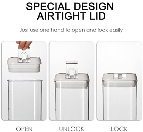 Air-Tight to keep food dry and fresh—-With special sealing mechanism, you can open or close our plastic containers safely by using only two fingers. Simply flip the ring to open or flip the ring down to lock and seal.