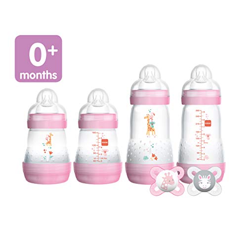 MAM Newborn Essentials “Feed & Soothe” Set (6-Piece), Easy Start Anti-Colic Baby Bottles, 0-2 Month Pacifier, Baby Shower Gifts for Baby Girl, Purple