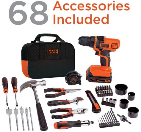 The BLACK+DECKER LDX120PK 20V MAX Cordless Drill and Battery Power Project Kit is a great power tool set for a variety of home projects. Includes 20V cordless drill, which provides an extra level of control with an 11 position clutch that prevents stripping and overdriving screws. The lithium ion battery is always ready and holds a charge up to 18 months. This battery powered drill kit includes 68 hand tools and accessories and a carrying bag for easy portability and storage. Includes carrying bag for easy portability and storage.