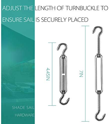 Adjustable Turnbuckle: help create tension to make your sails get tight in installation, which can make your shade sails stable, you can choose how far your sail shade is from the wall/ porch/wood to which it is fixed.