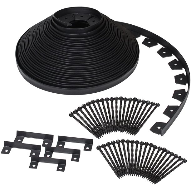 KIT INCLUDES: 100-foot coil of heavy-duty black landscape edging, 5 connectors to create a seamless border between different pieces of edging, and 40 8-inch nylon spiral spikes to hold edging in place