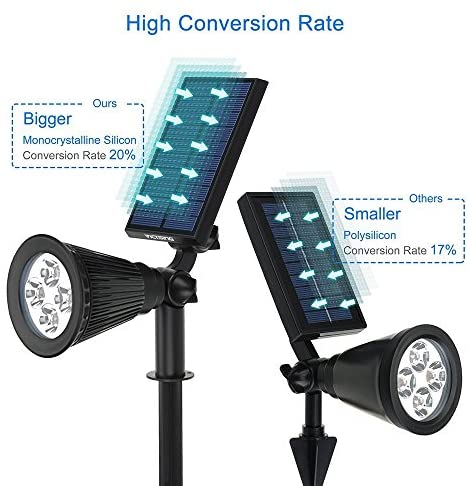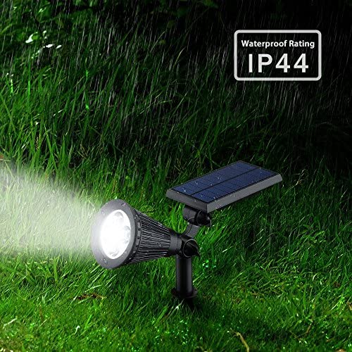 200 Lumen output LED solar outdoor spotlights, with high/low mode, waterproof and heatproof, Upgraded solar outdoor spotlights, Waterproof (IP65), Heatproof and Super Bright – 200 Lumen output, 4 x 50 Lumen enhanced LED, Automated Switch – Auto on at night / Auto off at sunrise.