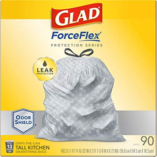Combining innovative features, drawstring convenience and Glad reliability, this 13 gallon kitchen trash bag handles the most demanding jobs in the kitchen and throughout the house. The three-layer drawstring ensures easy opening and closing. Even the fullest bags can be closed with one quick cinch, and the strong drawstrings make removal and carrying simple and secure.