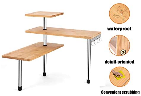 HYNAWIN 3 Tier Corner Shelf Bamboo & Metal Storage Spice Rack-Desk Bookshelf Display Shelves Space Saving Organizer -Adjustable Rack for Kitchen,Bedroom, Office-Creative Home Décor with Hooks