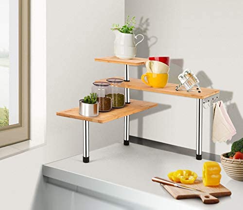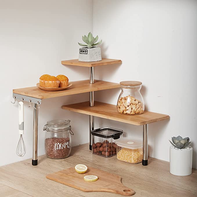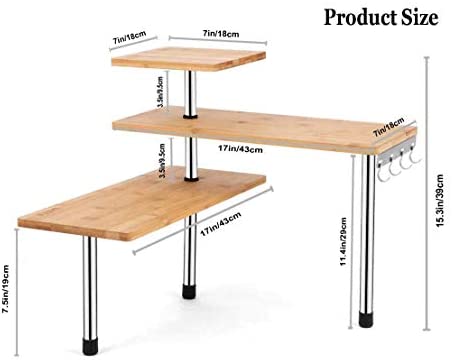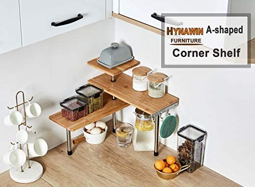 Home Home and Kitchen HYNAWIN 3 Tier Corner Shelf Bamboo & Metal Storage Spice Rack-Desk Bookshelf Display Shelves Space Saving Organizer -Adjustable Rack for Kitchen,Bedroom, Office-Creative Home Décor with Hooks