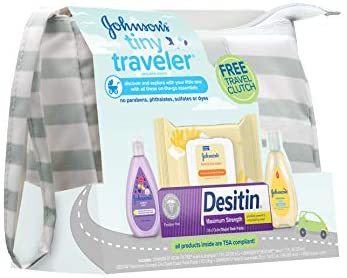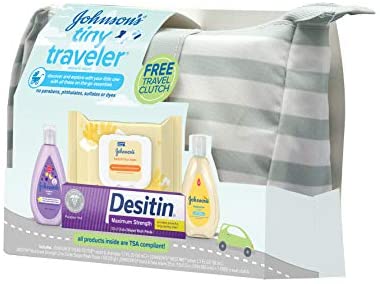 Johnson’s Tiny Traveler Gift Set lets parents discover and explore with their little one. Designed with input from parents like you this baby travel gift set contains an assortment of travel-size baby essentials specially designed for baby’s delicate skin and hair. Great as a baby shower gift, this travel gift set includes a baby wash and shampoo, lotion, hand and face wipes, and diaper rash cream, all tucked into a travel clutch that’s made of splash-resistant materials and easy to wipe clean. The convenient clutch is small enough to carry with you when you’re on the go and large enough to hold changing essentials, even a diaper. The products in this gift pack are TSA compliant; hypoallergenic; pediatrician-tested; and free of parabens, phthalates, sulfates, and dyes.