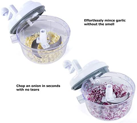 SAFE & CONVENIENT – A great alternative to electric food choppers that can be bulky, noisy, expensive and hard to clean. The chopper’s components come apart for easy cleaning. Just rinse with water after use and drip dry. Blades are concealed during operation for utmost safety. Included food safety holder grips food safely and securely allowing you to chop every last bit without risking a finger. Chopper and all parts are made from BPA free food safe plastic.