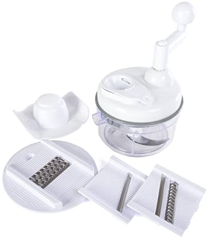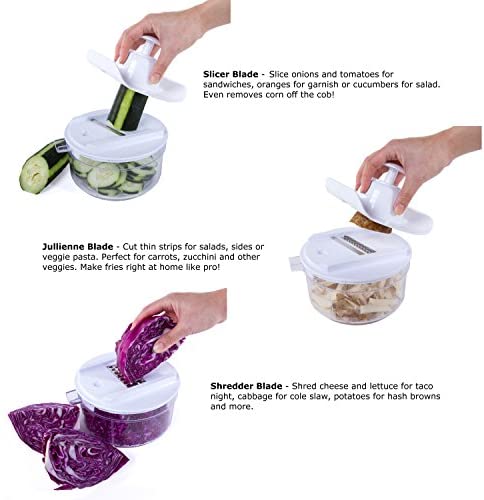 VERSATILE – Perfect for slicing vegetables, chopping nuts, herbs, salsa, hummus, guacamole and more. Chop onions in seconds without crying and garlic without stinking up the kitchen. Chop veggies, shred cheese and make hash browns all with one tool! Manual operation allows you to achieve the consistency you want. Spin a few times for large chunks, spin more for smaller ones, and keep on turning if you want to puree the food.