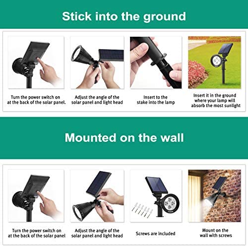 2 Brightness lighting Modes(Always on)& Automatic Switch—4 LED bulbs offers 2 different working modes(high/Low), allowing it to stay lit for 6-10 hours after being fully charged. With the dusk-to-dawn sensor, the solar landscape spotlights easily absorb the sunlight during the day and automatically turn the lights on at dusk for a hassle-free illumination