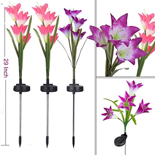 WOHOME 7 Color Changing lily solar flower lights outdoor 3 Pack with vivid lily flower spice up your garden.Rugged stainless steel stake and high-grade waterproofing,which ensure the solar flower lights still charge normally after the storm and rain. Solar garden stake flower lights will make your family nights, friends party, dance party, birthday party more dazzling! And spend every wonderful night with you !