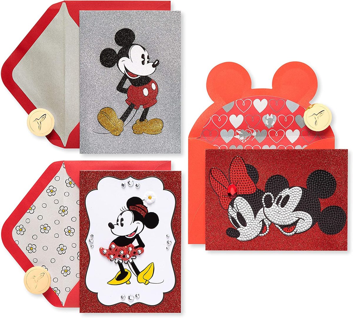 - Set of three beautiful Disney Mickey and Minnie Mouse cards One birthday card and two blank cards for personal messages Envelopes and unique Papyrus gold seals included Extra postage may be required