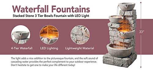 Be the first to review “Peaktop 201601PT Floor Stacked Stone 4 Tiered Bowls Waterfall Water Fountain for Outdoor Patio Garden Backyard Decking with Led Lights and Pump, 33″ Height, Gray” Cancel reply
