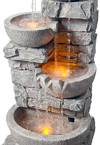 Home Patio, Lawn and Garden Peaktop 201601PT Floor Stacked Stone 4 Tiered Bowls Waterfall Water Fountain for Outdoor Patio Garden Backyard Decking with Led Lights and Pump, 33″ Height, Gray