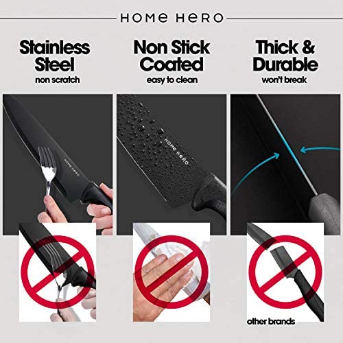 As much as we all love innovation, we love to look back at the things we know best, don’t we? That’s why our designers at Home Hero crafted a modern Knife Set using something we all know – stainless steel. Our premium stainless steel knives are carefully coated with a non-stick paint that make them perfect for any cutting, chopping or slicing without worrying about a thing.